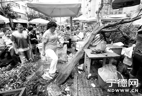 昨日,今年第23號強(qiáng)臺風(fēng)“菲特”來勢洶洶,于凌晨在我市福鼎登陸,寧德市區(qū)也出現(xiàn)狂風(fēng)。市區(qū)隨處可見被大風(fēng)刮倒的樹木,有些甚至被連根拔起。在市區(qū)鶴峰市場,幾棵高大的行道樹被連根拔起,傾倒在路旁,一些小販緊挨著斷樹照常營生,前來買菜的市民在斷枝殘葉中小心行走,路過道路旁倒地不起的樹木,不免會感到心慌。