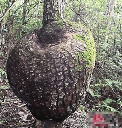 株洲炎陵龍?zhí)洞澹豢盟追Q煙苞樹的樹上長了一個特大樹瘤,圓滾滾的,像極了孕婦“懷胎十月”。該樹樹齡約50年,高2.8米,直徑不足30厘米,但樹瘤直徑1.1米,高1.22米。