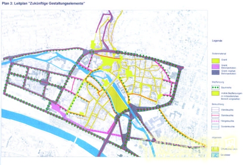 引導性規劃的目的是對城市中心區與緊鄰區域的各街道公共空間做出空間效果范例和景觀設計準則,需以其歷史層次為基礎來建構,并意圖表現或強化目的空間的特征,標明主要用地的使用類型,定義交通面積的分配,描述各種塑造元素的可能性,例如鋪地的形式、色彩和材料,照明的種類和形式。從而為未來獨立街道空間的設計提供基本設計的工作目錄,并非試圖代替其詳細設計工作,而是為其具體設計工作提供工作范圍與工作基礎。