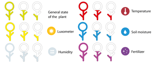 Fliwer會(huì)通過不同的LED色彩來提示植物的關(guān)鍵參數(shù)狀況,其中黃色代表光亮度、灰色代表濕度、紅色代表溫度、藍(lán)色代表水分、紫色代表養(yǎng)分。如圖所示,當(dāng)某種參數(shù)指標(biāo)下降的時(shí)候,就意味著用戶需要進(jìn)行相關(guān)的處理。