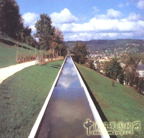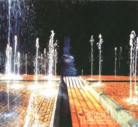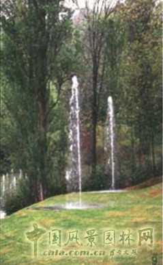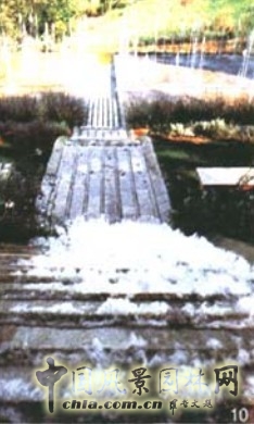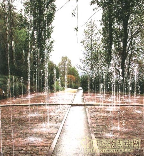 第六個(gè)主題景點(diǎn)——風(fēng)之軸線(圖7)穿過(guò)了露天劇場(chǎng),一直延伸花園的入口。風(fēng)之軸線是一組15m高的風(fēng)向標(biāo),細(xì)長(zhǎng)的金屬桅桿上頂著心驪體形的風(fēng)向標(biāo)和鈴鐺,約每隔15m出現(xiàn)一個(gè),從露天劇場(chǎng)斜斜地延伸向山下的城市。幾乎在全園的任何位置都可以看見(jiàn)這組風(fēng)向標(biāo),在山下的城市里也可以清晰地看到這組白色的風(fēng)標(biāo),風(fēng)之軸線是全園的地標(biāo)。