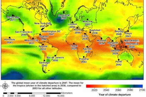 Mora的團(tuán)隊(duì)利用來自12個(gè)國家的39種不同氣候模型,對(duì)其展開了數(shù)據(jù)分析,他們得出結(jié)論–等到2047年,全球?qū)⒂谐话雲(yún)^(qū)域的平均溫度要高于曾在1860年到2005年間出現(xiàn)過的最高溫度。其中熱帶地區(qū)將有可能最早迎來這個(gè)“臨界點(diǎn)”;印尼首都雅加達(dá)將在2029年達(dá)到一個(gè)前所未有的高溫點(diǎn);哥倫比亞首都波哥大則在2033年迎來最高溫;美國境內(nèi)的多個(gè)主要城市的“臨界點(diǎn)”發(fā)生時(shí)間在2047年。