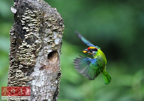資料圖片:金喉擬啄木鳥(niǎo)在給樹(shù)窩里的幼鳥(niǎo)喂食(2010年5月27日攝)。新華社記者 秦晴 攝
