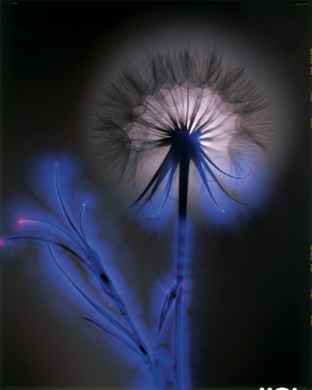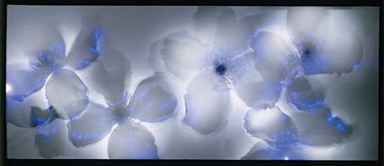 “白鐵線蓮”(2005),花朵懸浮在膠片之上,膠片與一根接地銅線相連。