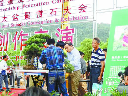 盆景藝術大師趙慶泉(右二)正在進行盆景制作表演