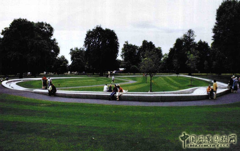 中國風景園林網訊 戴安娜王妃紀念噴泉是為紀念1997年8月辭世的英國王妃戴安娜而建。紀念噴泉位于倫敦海德公園蛇形湖畔左岸,耗資四千七百萬美元的工程,于2004年7月建成并對公眾開放,距戴安娜王妃逝世剛好七周年。噴泉是由545塊不同形狀的花崗巖組成,長度約210M,輕盈的穿插在現狀地形中的卵圓形的水景裝置。它通過地形的高差變化把水流從南側的水源處向東西兩個方向引導,并最終匯入北側低洼處的水池,在水流通過花崗巖水渠的過程中,通過高差以及水渠機理的變化,展現出豐富的水景形態。