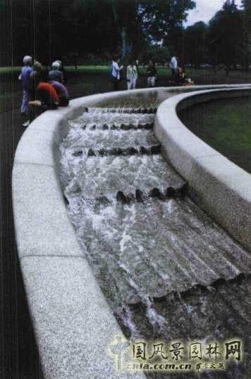 東側部分:水流沿著階梯狀的水渠向下翻騰流淌,而褶皺形式的表面特征又使階梯呈現出豐富的形態。設計者將此處的水景稱為“臺階”。階梯狀水渠之后為一個交叉口以供人們從環狀物噴泉的外側進入其內側。隨后水流又進入了另一個被稱作“搖滾”的區域,在這里改變造形的花崗巖水渠使得水流經過轉彎處時獲得了新的動力,在這里五個噴頭改變了水流的形式并將新的動力加入其中,設計者稱這里為“渦動”。