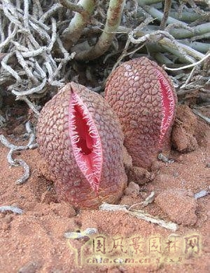 這種名為Hydnoraafricana的花生長在南非干旱貧瘠的沙漠地區(qū),是一種奇特的肉色寄生性花,花吸在附近灌木的根莖。發(fā)出惡臭的花簇吸引著成群結(jié)隊(duì)的腐尸甲蟲。如果你漫步納米比亞沙漠時(shí)聞到腐尸的惡臭,那它不是腐爛的肉類,而是根部寄生植物Hydnoraafricana。Hydnoraafricana生長在納米比亞西南部和南非北部海角等少數(shù)幾個(gè)地區(qū)。它屬于大戟屬植物。大戟屬植物在全世界有2000多個(gè)種類。它在納米比亞通常被稱為草原型大戟屬植物,是一種銀灰色肉質(zhì)灌木,最高可達(dá)兩米,根徑如木頭般堅(jiān)硬,外形如蜂窩。