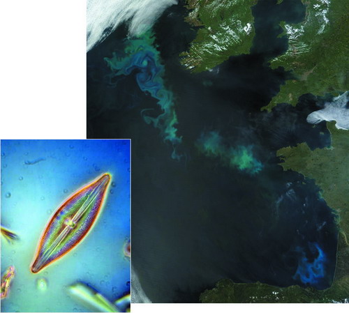 單細(xì)胞浮游植物(小圖)中的葉綠素能夠在海洋中形成巨大的綠色污跡。(圖片提供:NASA Earth Observatory Collection;Harry Taylor/Nikon Small World)