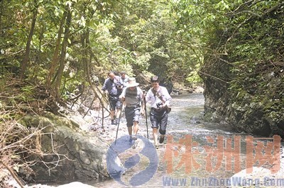 譚忠誠等人蹚水前行,尋找棚灣糧倉,發現了珍稀的穗花杉 譚忠誠 攝
