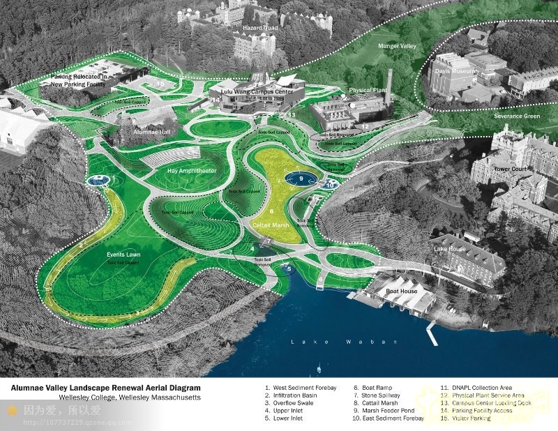 Alumnae Valley項目是將遭受污染的棕色土地轉變成綠色環保的典型景觀設計案例。Alumnae Valley景觀是MVVA公司對這個約5.5公頃的校園進行的長達7年改造的成果。經過改善之后,再也見不到那被嚴重污染的場景,取而代之的是一個美麗的生態家園。