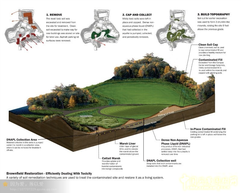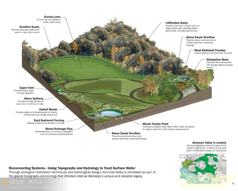 中國風景園林網訊 Alumnae Valley的改造被喻為”灰姑娘式”的規劃項目,因為她改造后宜人的生態景觀和山谷特色使衛斯理學校從長期的、嚴重的污染環境中解脫出來,并成為學校環境景觀的一部分。這個由范·瓦爾肯伯事務所負責設計的項目,榮獲了2006年美國風景園林師協會(ASLA)的綜合設計杰出獎。范·瓦爾肯伯其所創建的MVVA事務所多年來佳作不斷,在ASLA獲獎作品非常之多,充分說明其作品有其獨到之處。其設計作品更多關注生態與環境本質的東西,有時更讓人從中能領悟些什么,并不是那樣的平平淡淡景觀。