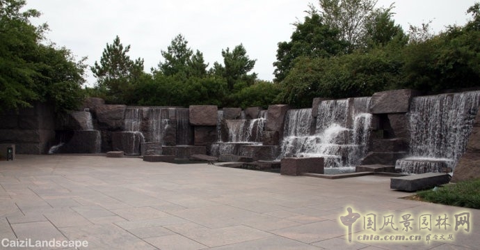 美國的景觀設計師對自然的理解是自由、生動的,現狀的自然景觀會是其景觀設計表達的一部分,自然熱烈而充滿活力,于是會有一大片的水面和巨大的瀑布、水層層跌落、自由地折過一個平臺,沖入下面深潭,流至更遠的一塊水面中…