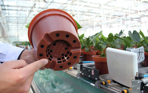 在花卉車間,只見所有的“紅掌”盆花整齊劃一地有序排放,再仔細一看,發現每一行的盆花所開的花朵都是一樣的,有3朵、4朵、5朵,“我們采用的是分級管理,奧妙就在于盆花的底部裝有芯片。”原來花卉車間的每個花盆內都嵌入了RFID芯片,通過圖像識別的自動分級裝備,提取芯片內盆花的株高、花冠面積、花色、花朵面積占比等指標進行分級,并通過四周的傳送帶,把不同花朵的盆花傳送到各自的槽內,管理更加輕松。除了盆花自動分級設備,這個花卉車間還采用了盆花移動式潮汐灌溉床、盆花全自動包裝機,這在國內都是首次研發亮相,這些新鮮設備的推出,大大提升了我國盆花工廠化生產的裝備水平。