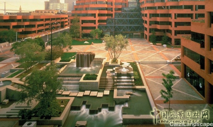中國(guó)風(fēng)景園林網(wǎng)訊 舊金山Levis牛仔褲總部的里維斯廣場(chǎng)(Levis Plaza)于1982年竣工。較之前的水景,該設(shè)計(jì)更為直觀的呼應(yīng)了西亞拉山區(qū)。代替了普通的混凝土材質(zhì),在主瀑布中哈普林直接運(yùn)用了由山區(qū)運(yùn)下的大塊花崗巖。里維斯廣場(chǎng)充分發(fā)揮了水和身體之間的各種互動(dòng)模式:矗立的巨巖頂端有水泉瀉下,引起行人的注目停留,兩旁樹籬圍起的開口進(jìn)入之后柳暗花明,可以環(huán)繞著巨石水池行走和水上踏石串起的步道,角落升起的水梯頂端也有泉水涌出。哈普林的水泉設(shè)計(jì)中最獨(dú)特的,是利用水的收集和運(yùn)動(dòng)來(lái)邀請(qǐng)行人和環(huán)境互動(dòng),使他們從觀眾變成參與者。