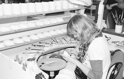圖為康佩陶瓷廠女工正在繪制圖案。