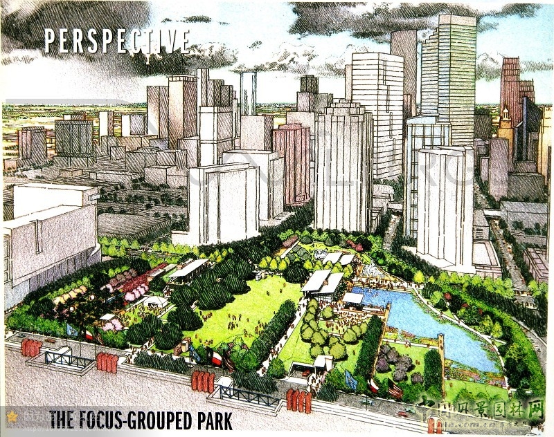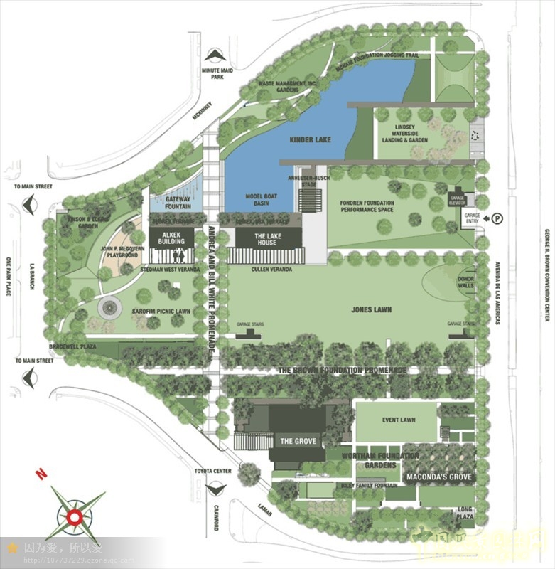 中國風景園林網訊 Discovery Green這個大型公園位于休斯敦城中心,功能上講是一個比較典型的城市公園,園內包括了遛狗園、咖啡廳、表演亭、小植物園、大草坪和人工湖等等城市公園的典型分區。歷史上這里是停車場,后來改造成開放空間。公園的結構非常清晰,一個個功能分區在平面上由不同的幾何塊體空間表達出來,空間的邊界做得十分精彩。