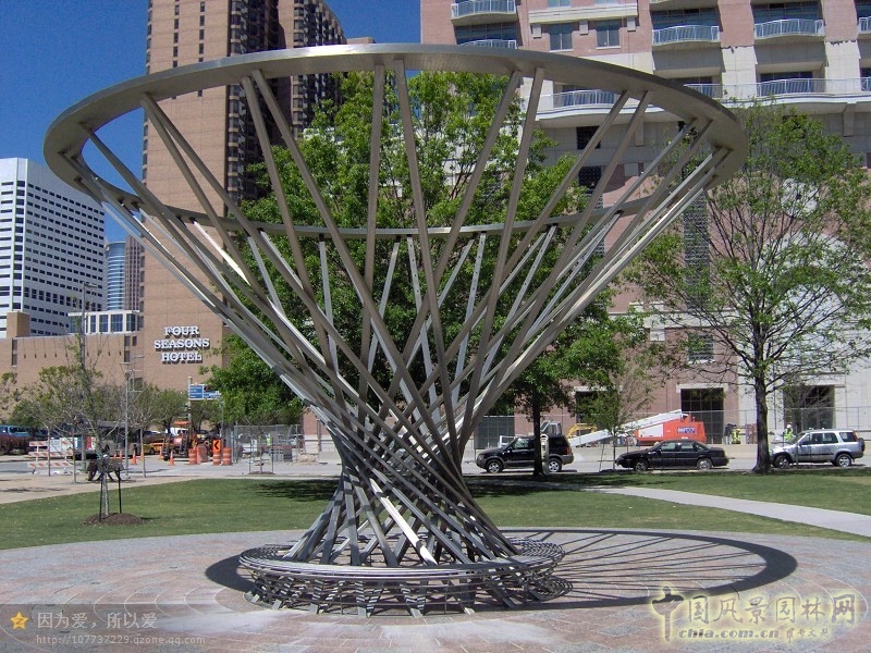 “霧樹(shù)”是由藝術(shù)家道格霍利斯設(shè)計(jì)的兩個(gè)實(shí)用雕塑之一。有時(shí)是外圍管道噴水形成水簾,有時(shí)則是噴霧。