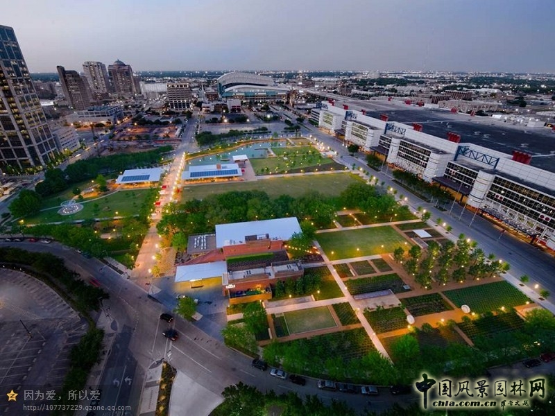 設計的其他部分圍繞兩個交叉軸線展開,這兩個軸線都是原先的街道。“那里原本就有一條橡樹小徑,這在很大程度上引導了設計,”同樣是FASLA成員的喬治·哈格里夫斯說道。橡大小徑改造成的布朗步行區(The Brown Promenade)如同花園一樣,郁郁蔥蔥的樹木和長凳,游人可以坐在樹蔭下俯瞰草坪。設計時,為了填補小徑缺少的一些樹木空缺,設計師將其他商業區中原本預定移除的大橡樹移栽到此。