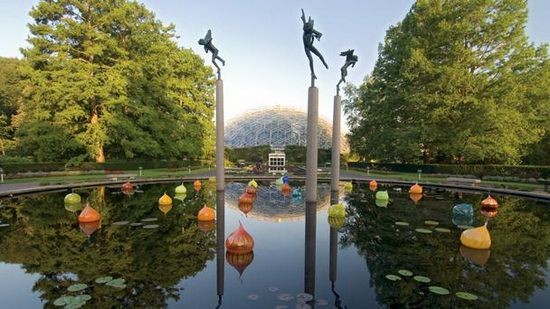 全美歷史最悠久的植物園是位于美國(guó)密蘇里州的蕭氏植物園,它是由植物學(xué)家和慈善家HenryShaw出資建造的。多面體穹窿(如圖)是本園亮點(diǎn)之一。占地半英畝(約2023平方米)的熱帶雨林主題花園種植著1400余種的植物,比如香蕉、可可樹(shù)、咖啡、蘭花等,意想不到是這里還有水族館呢。水池和瀑布為游客營(yíng)造出茂密熱帶雨林的感覺(jué),吹制玻璃藝術(shù)大師DaleChihuly玻璃雕像位于多面體穹窿下的蓮花池中。