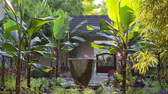Chanticleer花園坐落于美國(guó)賓夕法尼亞州,園內(nèi)涵蓋了熱帶植物、野生花卉、樹(shù)林、水生植物及草本植物等多種植物種類(lèi)。從市區(qū)到花園僅需30分鐘的車(chē)程,讓您遠(yuǎn)離城市喧囂,體驗(yàn)自然風(fēng)情。設(shè)計(jì)師將花園規(guī)劃為5座花圃,每片花圃都種植著不同品種的花卉,比如茶杯花圃(如圖),那里就種植著香蕉樹(shù)和攀緣植物。