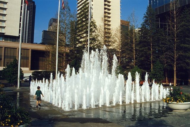 達拉斯噴泉廣場無疑是丹·凱利20世紀80年代中期的又一經典之作,廣場中清晰的網格結構、整齊排列的水衫樹壇、高低跌落的水流與噴泉,無不在向我們展現著凱利對場所精神的準確把握和天才的設計思想。這座廣場的主體建筑是貝牽銘事務所設計的一座60層高的玻璃幕墻建筑(它在傲視周臣建筑的同時也反射著耀眼的太陽光,使得本來就十分炎熱的達拉斯雪上加霜)。丹·凱利第一次來到現場時,就決定要用水體來激活這個龐然大物周圍的環境。“不僅僅是復制自然,而是將人自然的體驗引入城市環境中來。”噴泉廣場面積為6英苗,70%為水砸所覆蓋。廣場兩面緊鄰繁忙的羅斯大道與街道,這兩條街道之間有12英尺的高差,因此設計時必須盡量避免阻礙街道間繁忙的步行交通穿越。場地條件使得丹·凱利選擇利用一系列大小變化的跌水來消除高差。在設計師彼得·沃克的帶領下,丹·凱利事務所的設計師們用了三年時間來完善他的這一天才設想。