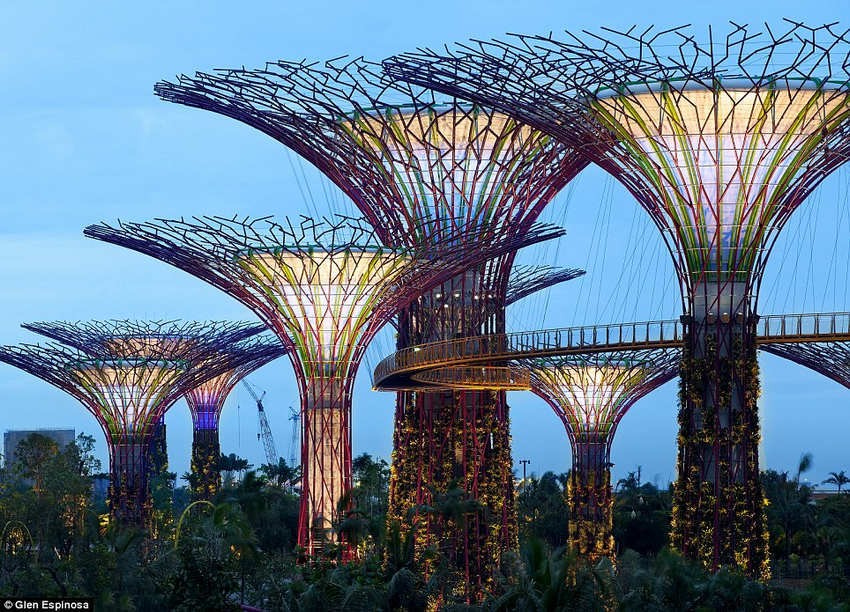 由Grant Associates事務所設計的這18棵超級樹(Supertrees)作為塔狀垂直花園,可吸收雨水,生成太陽能,同時也是溫室的通風管道。