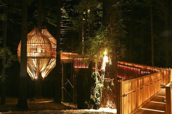 樹屋都在地面以上四至六米高的地方,通過坡道、小橋或者可收縮樓梯上去。住宿的選擇包括“鳥巢”,正像你所猜的,一個類似于巨大鳥巢的建筑物;“UFO”類似于老式科幻電影中的飛碟;而“小木屋”是一個楔入樹干間的寬敞木棚。