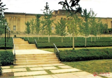 由于展覽館與室外地面一定的高差,凱利借鑒了意大利臺地園總設計法,就勢設計了五級臺地,以此作為室內外環境的過渡空間。每級臺地上都種植了五棵銀杏樹,作為展覽館建筑南立面的“綠墻”,它們有著相同的節奏,人們穿行其中時就好像在展覽館中的畫廊一樣。