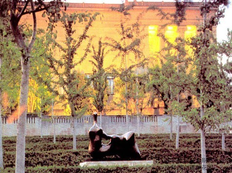 摩爾的雕塑點綴在樹林與地形中,等待人們去發現,作品“點與垂直運動第九號”掩映在一叢花灌木中,著名的“相依”被放置在第四級臺地之上,主園路的盡頭則布置了雕塑“坐著的女人”,雕塑“綿羊”則安然臥于草坪中央。