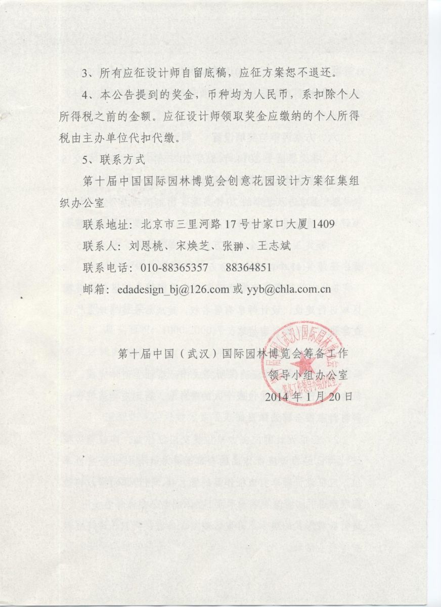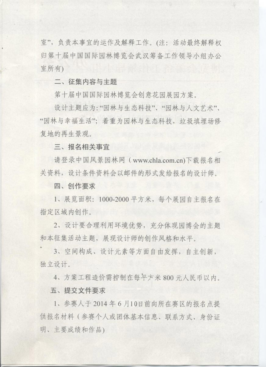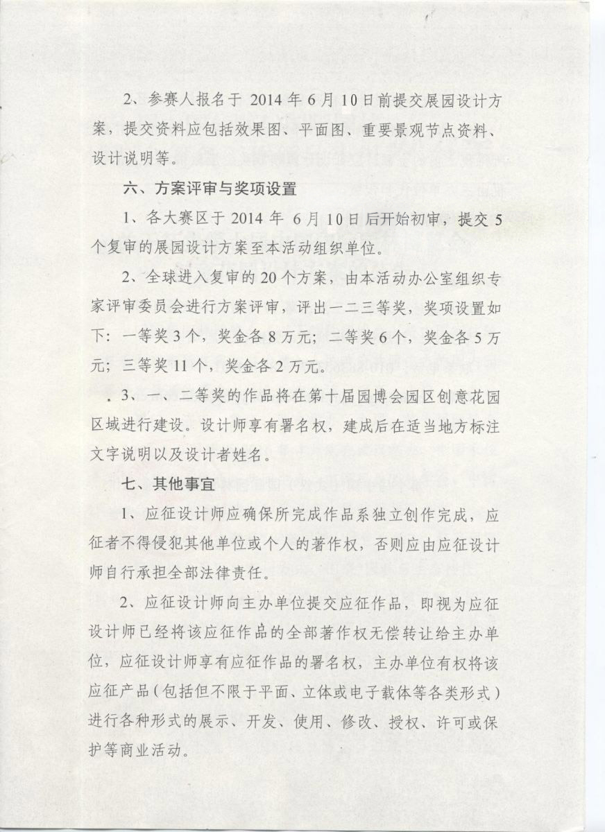 2、參賽人報名于2014年6月10日前提交展園設計方案,提交資料應包括效果圖、平面圖、重要景觀節(jié)點資料、設計說明等。
