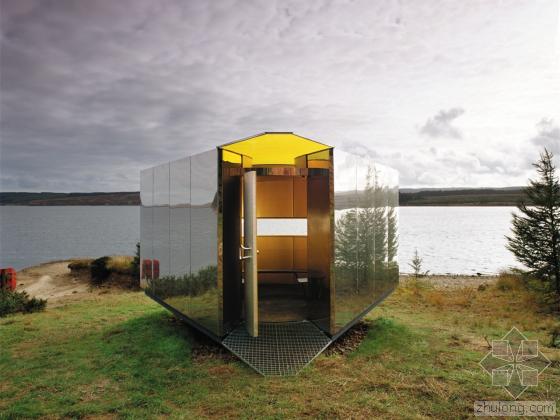 此次介紹的設(shè)計作品是由倫敦事務(wù)所Softroom完成設(shè)計。它坐落在一片開敞的草坪之上,金屬鏡面外皮讓建筑超脫于自然環(huán)境,產(chǎn)生強(qiáng)力的對比,人們可以進(jìn)入其中躲避糟糕的天氣或者進(jìn)行短暫的休憩。