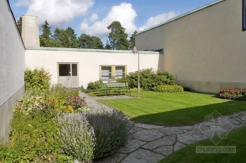萊韋倫茨的主要任務是美化景觀,并將建于1926年、帶有古典主義色彩的小教堂進行修復,使其煥發昔日風采。而阿斯普隆德主要致力于大的建筑物,將建于1934-40年間的火葬場重新修建起來,這既是他自身職業的要求,也是二十世紀三十年代整個社會大環境的發展趨勢。兩位建筑師進行了最完整的設計部署,大到整個風景區,小到每個燈飾。斯科斯累格加登公墓完成于1940年,其結果可謂是整體和諧,融自然與建筑于一體。由于考慮到了諸多的實踐因素,建筑任務具有嚴格的要求:例如,火葬取代土葬就是建筑師們務必遵循的原則之一。火葬場中有三個舉行儀式的房間,即宗教信仰小禮拜堂、寄予希望的禮拜堂和圣潔的十字架,與斯科斯累格加登公墓的主要入口緊密相鄰。一塊獨自矗立于草地上的巨大的花崗巖十字架將這里的風景襯托得更加完美。
