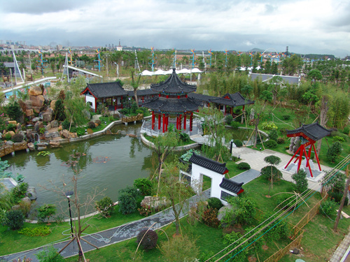 規模:占地面積達6.76平方公里,其中陸域面積就達3.03公里。由九座島和兩座半島組成。九島中五座為展園島,小的四座為生態景觀島嶼。15座各具特色、風格各異的景觀大橋,園區各島還建有30多座星羅棋布的園林景觀小橋。整個園區水系縱橫,溪流蜿蜒,環閣繞亭,將我國各流派的樓閣串連,移步換景,心曠神怡,流連忘返。園在水上,水在園中,"藍天映碧海,碧海襯藍天",氣魄宏大,絕無僅有。