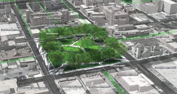 摩爾廣場這座城市瑰寶如今正在走向衰敗,需要進行改善和提升以適應羅利市區日益繁榮的城市生活。廣場的總體規劃建立在它最為獨特和重要的特點之上,通過建設集中的城市地貌,增加了它的體驗性,生態價值和總體規劃范圍。這個富有特色的設計激發了場地的活力并在視覺上和功能上對場地進行了重新的組織,使其變成特色鮮明的空間。改造后的廣場擁有比現在更為廣泛的用途。中央地形概念巧妙地打破了傳統的棋盤式道路布局,釋放了廣場中潛在的空間,增修了36%的道路,增加了2.5倍的蔭蔽空間,綠化覆蓋率增加了39%,休閑座椅的數量增加了10倍,原生棲息地面積也擴大至原來的3.45倍,同時保留了原來場地95%的開放空間。這項簡單的干預使這個占地4英畝的場地的利用效率達到最大化,增加了人們的活動選擇范圍,擴大了游客的體驗空間,并且形成了以公園用途為主的靈活的戶外空間環境。這個廣場變成了一個可以提供良好視野和廣闊綠地、同時可用作緊急避難和休閑娛樂的場所的多維空間。游覽摩爾廣場猶如進行一次探險活動,可以體驗到景觀逐步在眼前展開的樂趣,并且在路線上擁有多樣性的選擇。