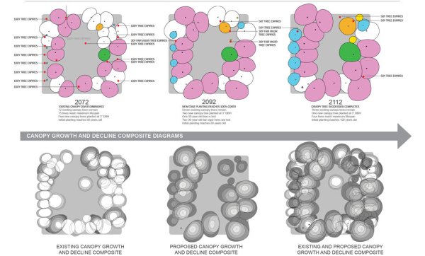 原來的道路并沒有改動,以最大限度的減少對于植物根部的破壞,僅僅是去掉了可移動的花盆,以增加景深?,F有的鋪路材料都要進行回收,并用于建造令人興奮的可以承接大型和即興的演出活動的功能靈活的新廣場。廣場的地勢提供了天然的演出平臺,位于北部的緩坡可以作為半圓形的露天劇場,或者作為人們享受日光浴和欣賞美景的場所。可持續性的景觀設計實踐,例如將雨水匯集到雨水花園中,在自然地域增加生物棲息地等,確保了設計有益于生態系統,同時也建造了一個讀書冥想空間和觀鳥勝地。