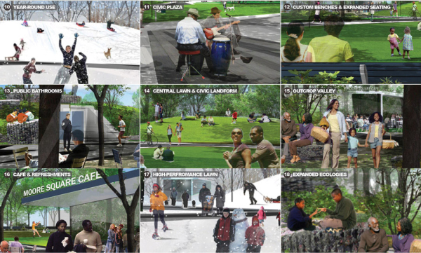 人們會不自覺的被帶入新摩爾廣場的情境之中,并且體驗(yàn)到一種受歡迎、安全和興奮的感覺。公園就像一個(gè)市民劇場,連續(xù)的植物種植策略使得公園的邊界、草坪、緩坡和古老的橡樹林受到保護(hù)并變得富有生機(jī)和活力。廣場中日益增多的活動使其成為象征羅利市生機(jī)和活力的標(biāo)志性場所。通過市民對廣場的使用,摩爾廣場具有了作為人文景觀的的象征意義。通過增加人與人之間交流的機(jī)會,摩爾廣場在21世紀(jì)得以繼續(xù)使用,并向之前的歷史進(jìn)程致敬。