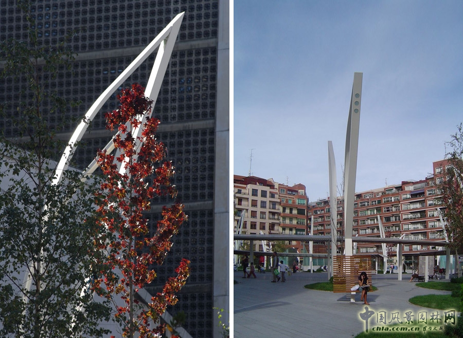 在植物景觀配置上,設(shè)計師沿著廣場的中央圓環(huán)栽種了楓樹、楓香、樺樹等落葉樹種,外圍則種植了一些常綠樹種。落葉喬木隨著季節(jié)的變化變幻著色彩,使廣場季相分明。