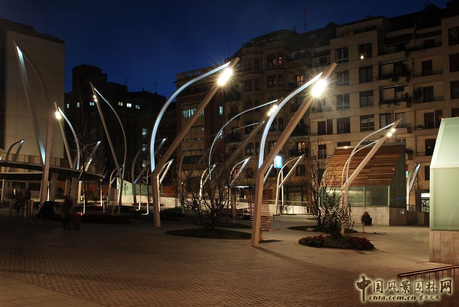 廣場上的燈具造型突出,形狀有些像葉子,成為廣場上不可忽略的主要元素。圍繞中心大圈玻璃廊的是10米高的燈具,它們?yōu)橹行牡拇笮褪录突顒犹峁┱彰?。第二圈布置?米高的燈具,最外圈布置了6米高的燈具,這兩圈燈具主要負(fù)責(zé)廣場外圍的照明。第一圈層的燈光是整個廣場的主導(dǎo)光源,剩下的燈光都散布在四周。