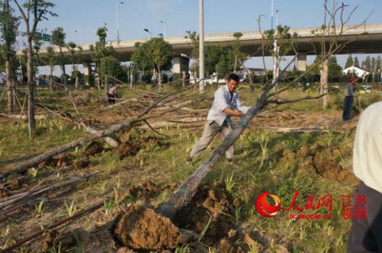 記者將死樹問題向常州市市政管理處進行了反映,兩小時后現場來了一批工人,將死樹全部拔掉。按照一些工人的說法,這些樹的死因很可能是反季節種植所致。常州市市政管理處工程三科副科長虞偉俊告訴記者,經現場核實,宗家塘共種植景觀樹720棵,死亡約250棵,死亡率約35%。導致樹木死亡的原因可能是異地苗源不適應當地氣候,也可能是栽種時過了最佳種植時期,也不能排除施工單位養護管理沒有跟上。