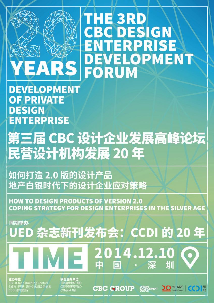 第三屆“CBC設計企業發展高峰論壇:民營設計機構發展20年”將于2014年12月10日首次落戶深圳。論壇由CBC(ChinaBuildingCentre)、《城市·環境·設計》(UED)雜志社、CCDI悉地國際主辦。活動期間將迎來40位中國最有代表性的設計院院長和20位中國最有影響力的房地產商高管,共同探討如何打造2.0版的設計產品,如何構建地產白銀時代下的設計企業應對策略。中國設計專業化發展的關鍵人物和企業領航者將在這里發表主題演講并進行學術對話。同時,將有超過200位中國民營企業的設計院院長、境外設計企業代表、房地產開發商代表、關注設計企業發展的精英和專家前來參會。CCDI、三益中國、聯創、維思平、天津華匯、華陽國際、天華建筑、浙江綠城、萬科、SOHO中國、綠地、中海、中糧、陽光100置業集團、首創地產、華潤集團等國內有影響力的企業代表都將匯聚一堂,探討未來的發展道路。論壇同期將舉行“UED雜志新刊發布會:CCDI的20年”。