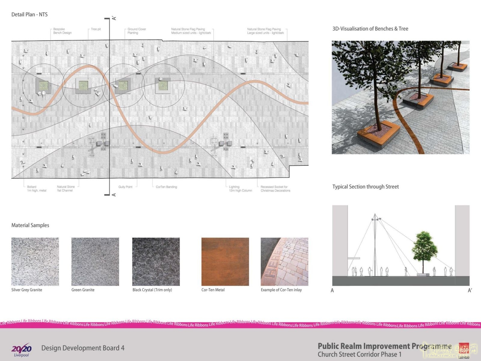上圖是設(shè)計師和一名藝術(shù)家合作完成的利物浦街道,完全是由藝術(shù)家進(jìn)行組織設(shè)計,設(shè)計的創(chuàng)意思想是“生命的飄帶”,他擅長運(yùn)用鐵、玻璃等材料造景。景觀設(shè)計師為了更加極致的將整個空間都貫穿設(shè)計的思想,將標(biāo)準(zhǔn)化做到極致,于是,地面鋪裝也采用飄帶的圖案,將樹池、座椅進(jìn)行整合,這就體現(xiàn)出景觀設(shè)計師和藝術(shù)家的在協(xié)作中的標(biāo)準(zhǔn)化。