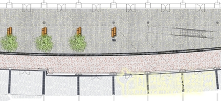 下圖是我們所做的一個利物浦的商業(yè)街區(qū),主色調(diào)是灰白色,但后來我們?yōu)榱四茏尳ㄖ念伾玫窖永m(xù),添加了紅色和黃色,以此來進行暖色調(diào)到冷色調(diào)的過度。為了不讓暖色調(diào)鋪裝太過突兀,我們將紅色系由密到疏一點點進行過度。黃色系本身是淺的,用深灰色花崗巖進行襯托;紅色本就偏深,便用淺色花崗巖進行襯托,以實現(xiàn)一種顏色上面的延續(xù)性。