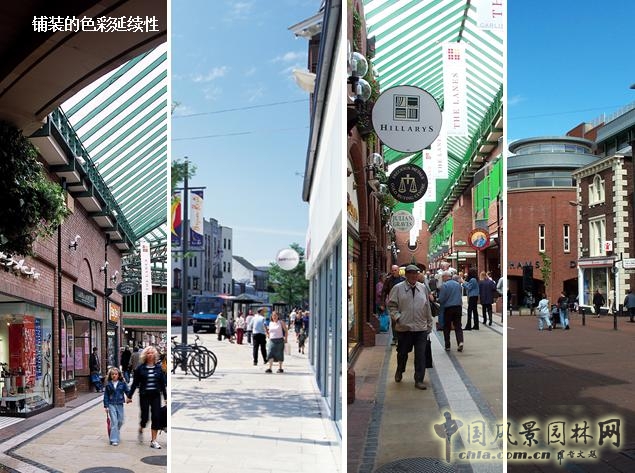 顏色方面也有重復性。這是幾條現(xiàn)代感的商業(yè)街區(qū),我們發(fā)現(xiàn)當建筑立面是暖色的,地面也就是暖色調(diào)的。地面越靠近建筑的地方,越是暖色調(diào)的延續(xù),逐漸由暖到冷。延續(xù)和重復可以從色彩上、質(zhì)感上、視覺上各個角度進行打造。