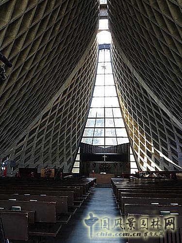 進入教堂后,視野自然沿屋面曲線上升至屋脊天窗,延伸于天空;天界之感召,空靈之境界,油然而生。教堂室內裝飾簡單樸素,室內面的清水水泥,忠實顯露,肋骨型之交叉梁,表明結構內部的應力方向。室內樓板及座席,皆用木制,增加堂內溫暖氣氛,與屋面清水水泥形成鮮明對比。