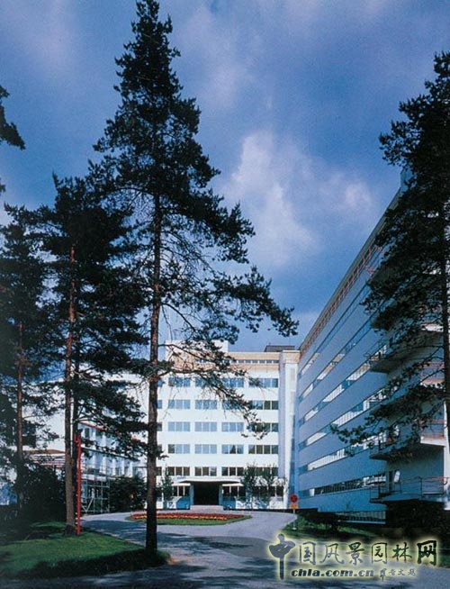 療養(yǎng)院周圍是一片樹林,用地沒有很多限制,建筑師可以自由地布置建筑的形體。