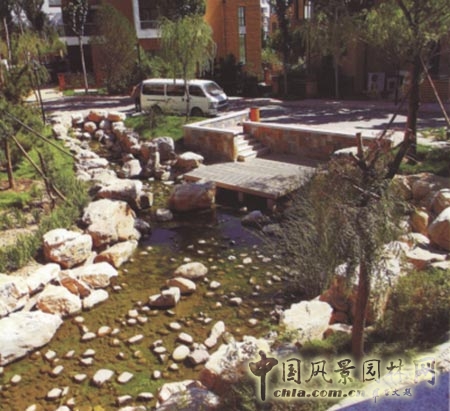 設計師充分利用地勢變化高差,做到戶戶有景。水體景觀也是依據地形起伏設計形態,以自然的卵石裝飾水面,并設置階梯式親水平臺,呈現出的是符合周圍環境的自然水景觀。無論是地形、地貌、植被還是溪流都與建筑共融共生。