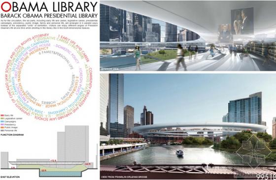 “方案O”旨在創造獨特的建筑形式呈現巴拉克·奧巴馬總統的魅力;以整體設計的理念呼應城市格網和水系的特色;以屋頂作為“第五立面”,成為芝加哥摩天樓的新對景;以屋頂上鐫刻的奧巴馬總統格言強化建筑的紀念性和莊重感。