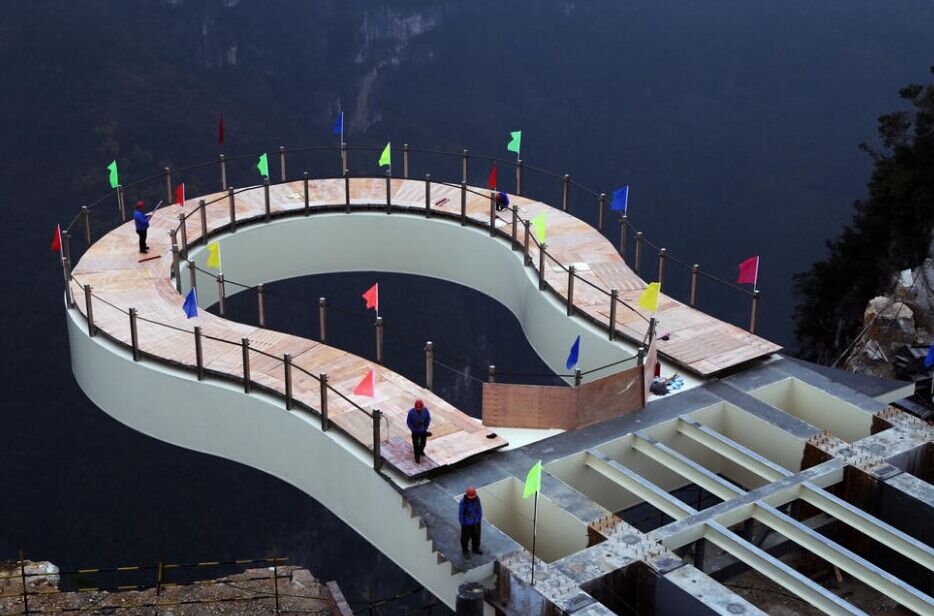 2015年2月11日,重慶云陽龍缸景區懸挑玻璃景觀廊橋最后一塊玻璃頂推成功,被譽為世界第一懸挑玻璃景觀廊橋正式建成,比舉世聞名的美國科羅拉多大峽谷玻璃廊橋懸挑還長5米多,將成為重慶旅游一大亮點,預計今年5月對外開放。該廊橋位于重慶市云陽縣龍缸核心景區,在海拔1123米的愛之路絕壁之巔。懸挑支出長度為26.68米,其中懸挑部分為21.34米,離地高度718米,采用無鋼架支撐,廊橋地面、護欄采用全通透超白玻璃制作,便于游客全方位觀景。