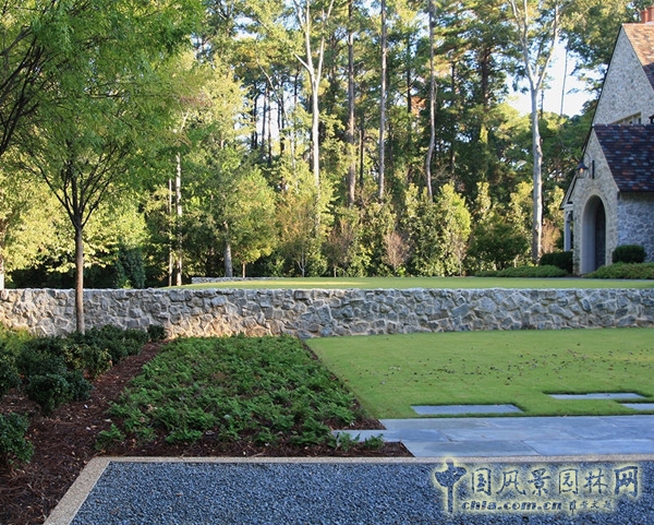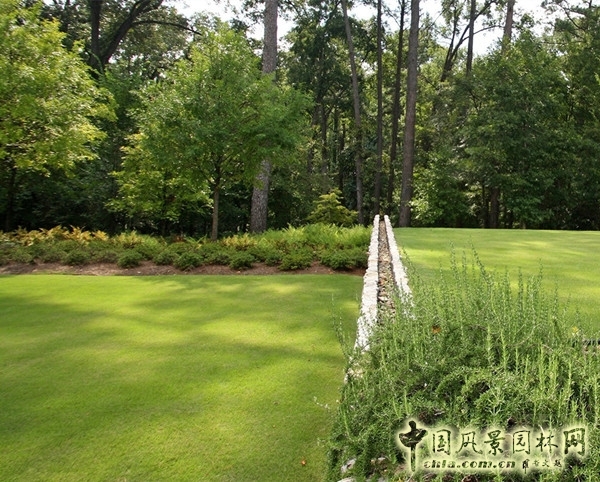 簡易的邊石采用了透水寬松的石灰?guī)r,石墻分隔開了階梯狀的草坪,石墻遠(yuǎn)處的平地是松樹闊葉林。